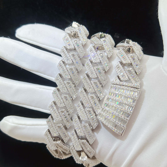 20mm Solid Silver Moissanite Baguette Diamond Miami Cuban Link Chain